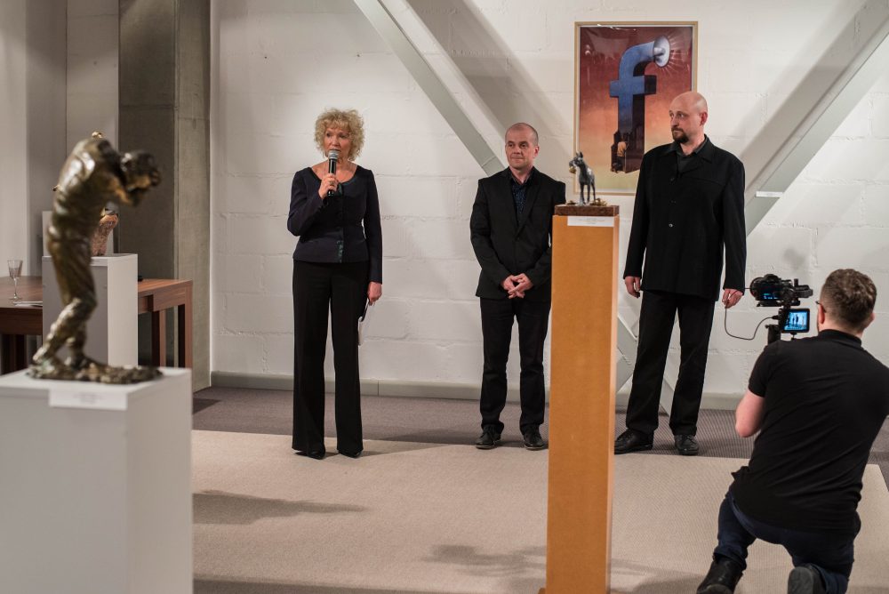 Oprócz rysunków mamy 16 rzeźb Norberta Sarneckiego – cztery wielkoformatowe. Artysta komentuje współczesność, również z dużą dawką ironii, jego reakcje na aktualne wydarzenia nie są natychmiastowe – nie pozwala na to technika twórcza.